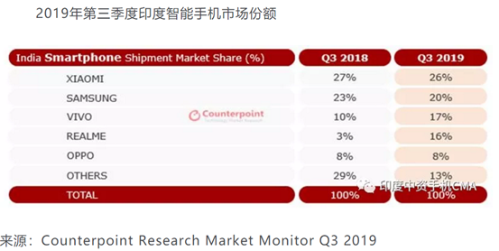 印度智能手機(jī)市場(chǎng)對(duì)于合力泰是一個(gè)全新的增量市場(chǎng)。2017年中國(guó)市場(chǎng)智能機(jī)滲透率約為96%,印度智能機(jī)市場(chǎng)僅有42%,年出貨量1億左右,由于整體手機(jī)出貨量以及智能機(jī)滲透率的差距,導(dǎo)致印度智能機(jī)目前出貨量?jī)H為中國(guó)市場(chǎng)的四分之一,未來(lái)隨著基礎(chǔ)設(shè)施建設(shè)、軟件應(yīng)用滲透完善,成長(zhǎng)空間十分廣闊。盡管2019年各行業(yè)經(jīng)濟(jì)放緩,但印度智能手機(jī)市場(chǎng)第三季度依舊實(shí)現(xiàn)兩位數(shù)增長(zhǎng),出貨量創(chuàng)新高,達(dá)到4900萬(wàn)部,增長(zhǎng)均來(lái)自智能手機(jī)主要品牌商如小米、三星、OPPO(REALME屬OPPO旗下品牌)、VIVO等,詳情見(jiàn)下表: